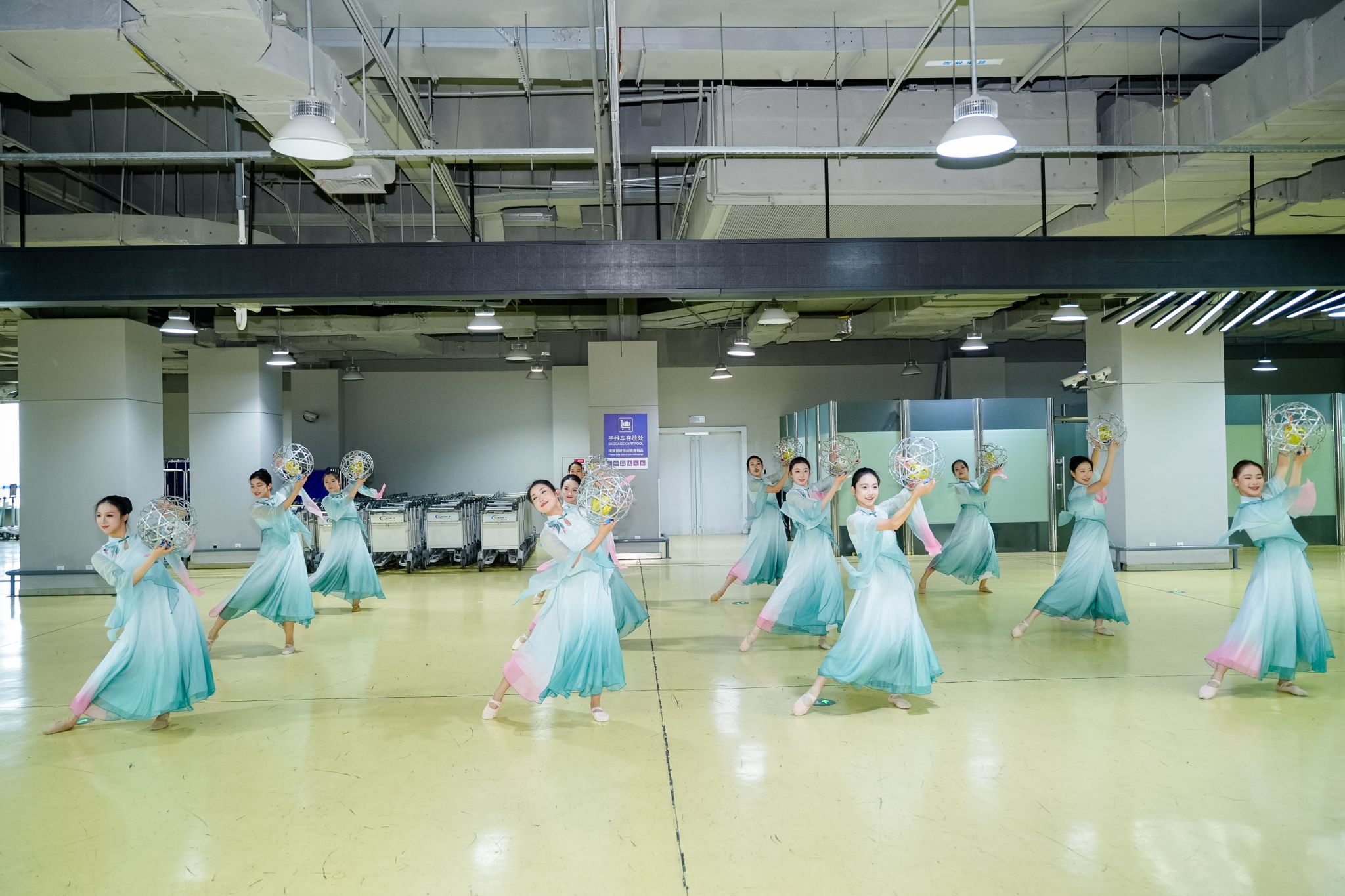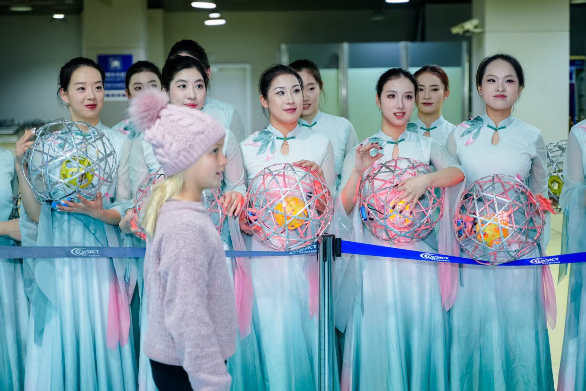 在室内贵宾通道,队员们化身非遗文化传播使者,开展沉浸式互动体验。队员们用流利的英语手把手教外国游客握灯、击打、旋转,耐心讲解滚灯、莲湘的历史渊源与文化内涵,用简单易懂的方式传递传统技艺的魅力。不少游客初次尝试便爱上这项民俗艺术,在欢声笑语中完成了一场跨越语言与国界的文化交流,让非遗在“入境第一站”就走进外国友人心中。