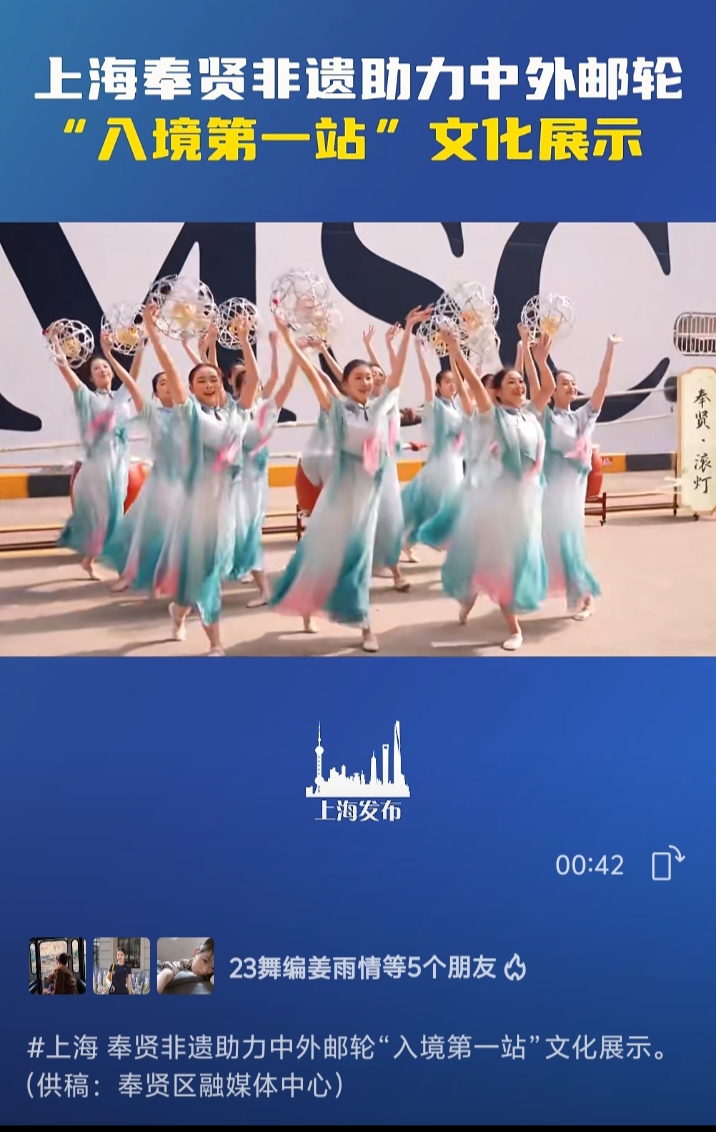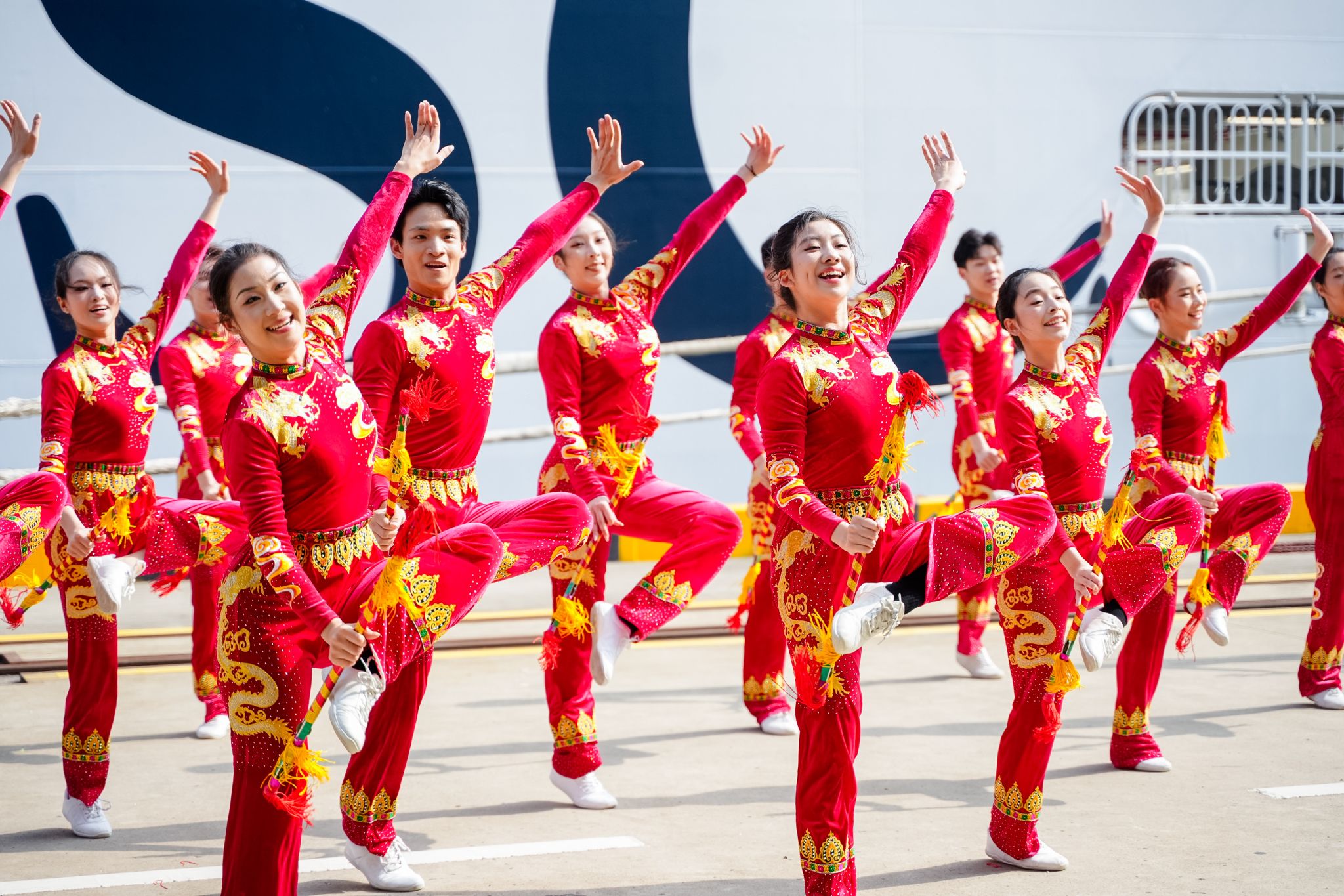 3月29日,上海吴淞口国际邮轮港迎来三船同靠盛况,MSC地中海邮轮“华丽”号、德国途易邮轮“迈希夫6”号、国产大邮轮“爱达·魔都号”齐聚码头,单日入境外籍游客再创新高。在上海市文旅局、上海市交通委,奉贤区人民政府等各项目单位关心和指导下,太阳成集团tyc9728非遗传承舞蹈队应邀亮相,在室外码头与室内通道精彩演绎非遗项目《小滚灯》《申韵莲湘》,累计完成四场展演,并走进贵宾通道与国际游客面对面互动教学。此次亮相不仅是校地非遗传承成果的集中展示,也是以韩春英教授领衔的2026年度上海市“中华文化国际传播”重点项目“文化出海”的实战预演与重要排练,艺院学子以青春舞姿讲好中国非遗故事,助力上海非遗传承与发展。