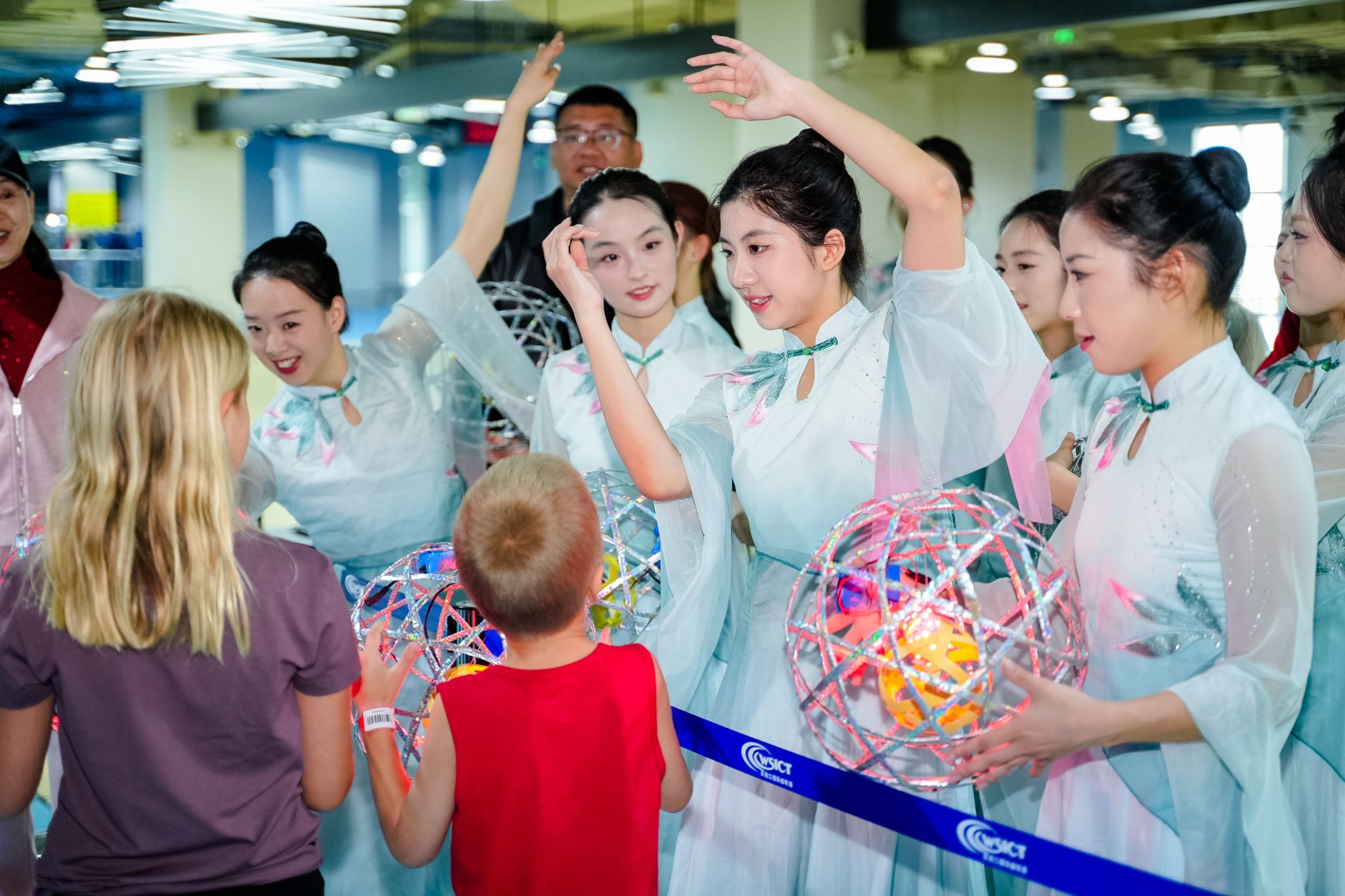 在室外码头和室内展区展演现场,队员们身着特色民俗服饰,伴随着铿锵鼓乐灵动起舞。《小滚灯》 刚健有力、翻转腾挪,灯影流转间尽显江南民俗的豪迈与灵动;《打莲湘》 节奏明快、身姿轻盈,彩棍敲击出清脆韵律,将民间喜庆氛围传递给每一位游客。两场非遗舞蹈轮番上演,赢得国际游客掌声不断,纷纷举起手机记录这一充满东方魅力的精彩瞬间。